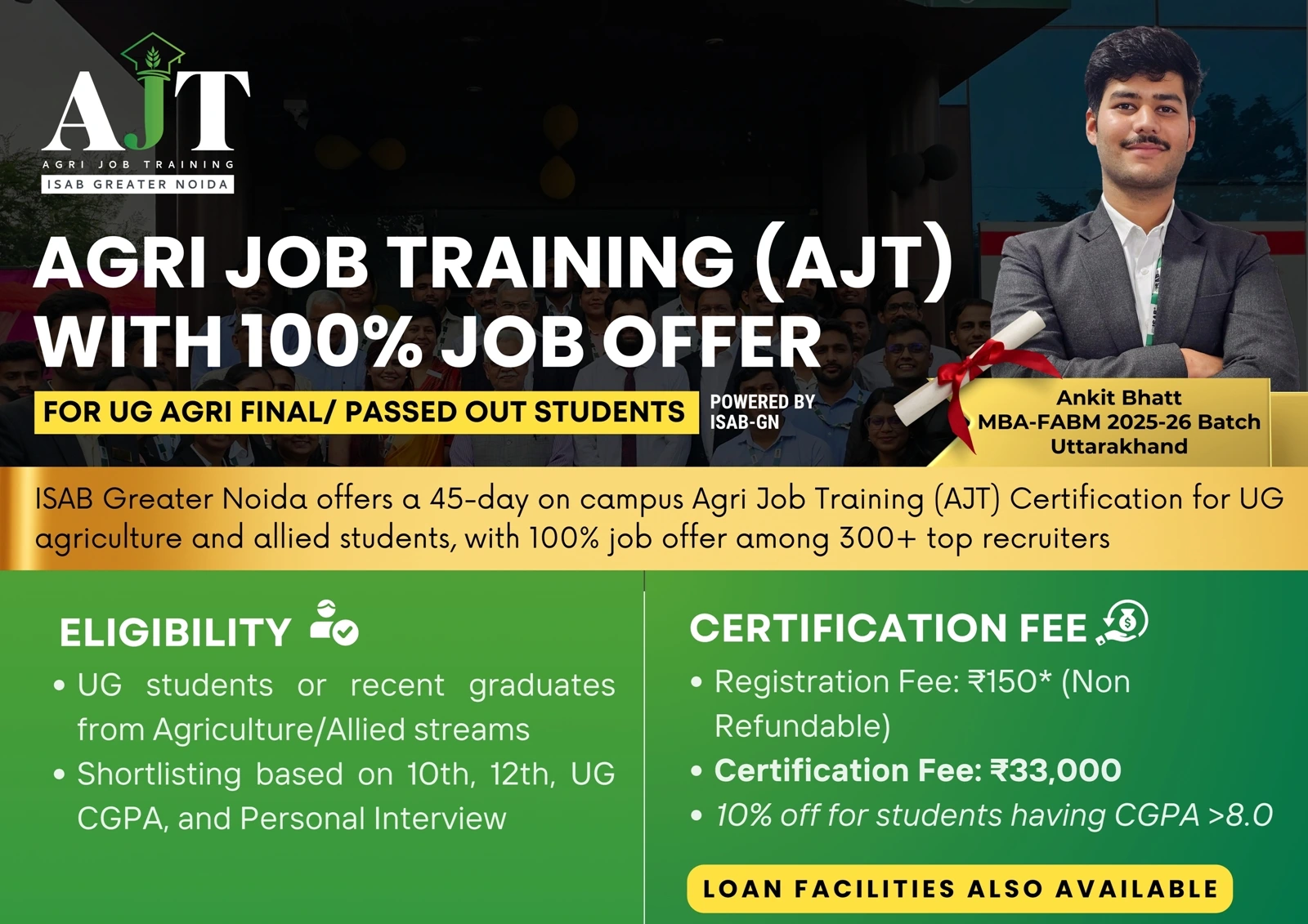 ISAB Greater Noida, founded by an IIM Ahmedabad alumnus, presents the Agri Job Training (AJT) Certification a 45-days job-oriented training program tailored for undergraduate students from agriculture and allied streams. Backed by 100% Job Offer with India's top 300 recruiters, AJT is your gateway to a thriving agri-career.
